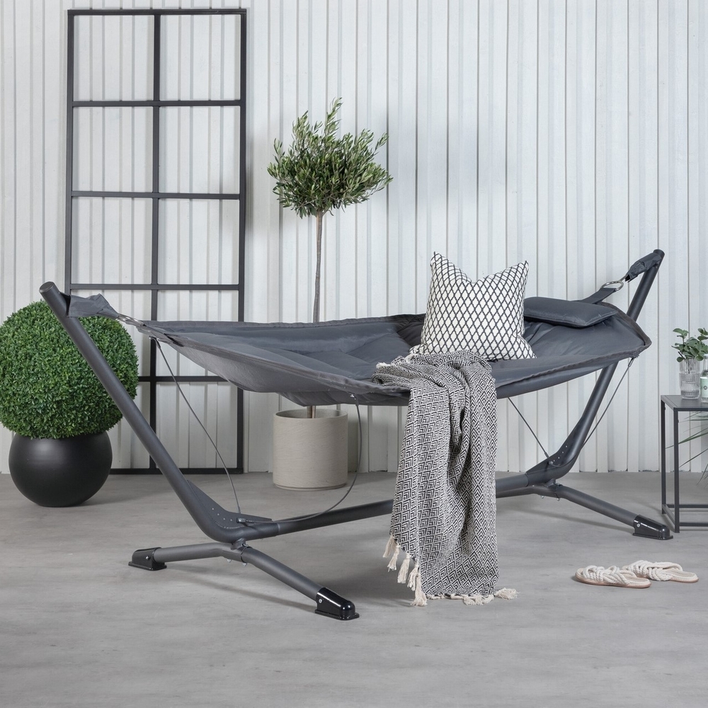 Koppla av ordentligt i en skön hängmatta. Nino är en helt bekymmersfri hängmatta som är perfekt för lata dagar i sommar. Läs en bra bok i skuggan eller njut av solen och upplev känslan av att flyga som en fjäder. Hängmattan är tillverkad i grått slitstarkt polyester som fungerar utmärkt i utemiljö - så våra skötselråd för bästa underhåll. Med tillhörande ställning i svart stål kan du enkelt förflytta hängmattan och placera den precis där du önskar. Tillåt dig själv att slappna av till fullo. Skötselråd: Polyesterdynor är smuts- och vattenavvisande och går att rengöra genom försiktig handtvätt och dropptorkning. Möbelskum funkar också bra.