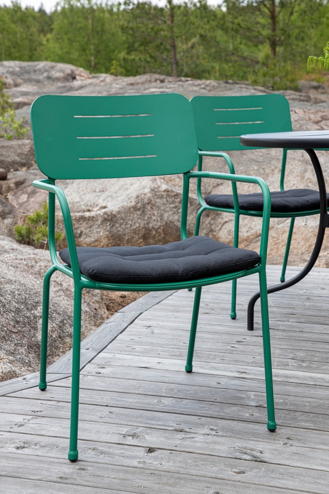Nicke är en nätt och färgstark stol i strålande grön kulör, som passar till alla sorters matbord. En stol i slitstarkt stål som lyser upp uteplatsen såväl som trädgården. Skapa en härlig känsla på uteplatsen med en smäcker färgklick och stilren design. Dynor finns att köpa till. Stolen är stapelbar. Skötselråd: Stål och mesh är två material som är avvisande mot smuts och vätskor. Däremot behöver man vara uppmärksam på att vatten ska orsaka fläckar och rost. Se därför till att torka av ytan med en en mjuk fuktad trasa och såpvatten, för att undvika att materialet rostar.