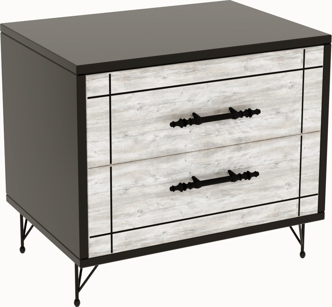 Sängbord av melaminbelagd spånskiva med ben av metall.