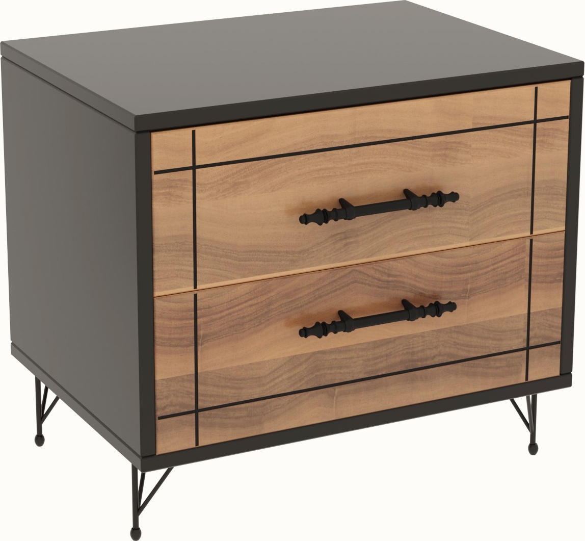 Sängbord av melaminbelagd spånskiva med ben av metall.