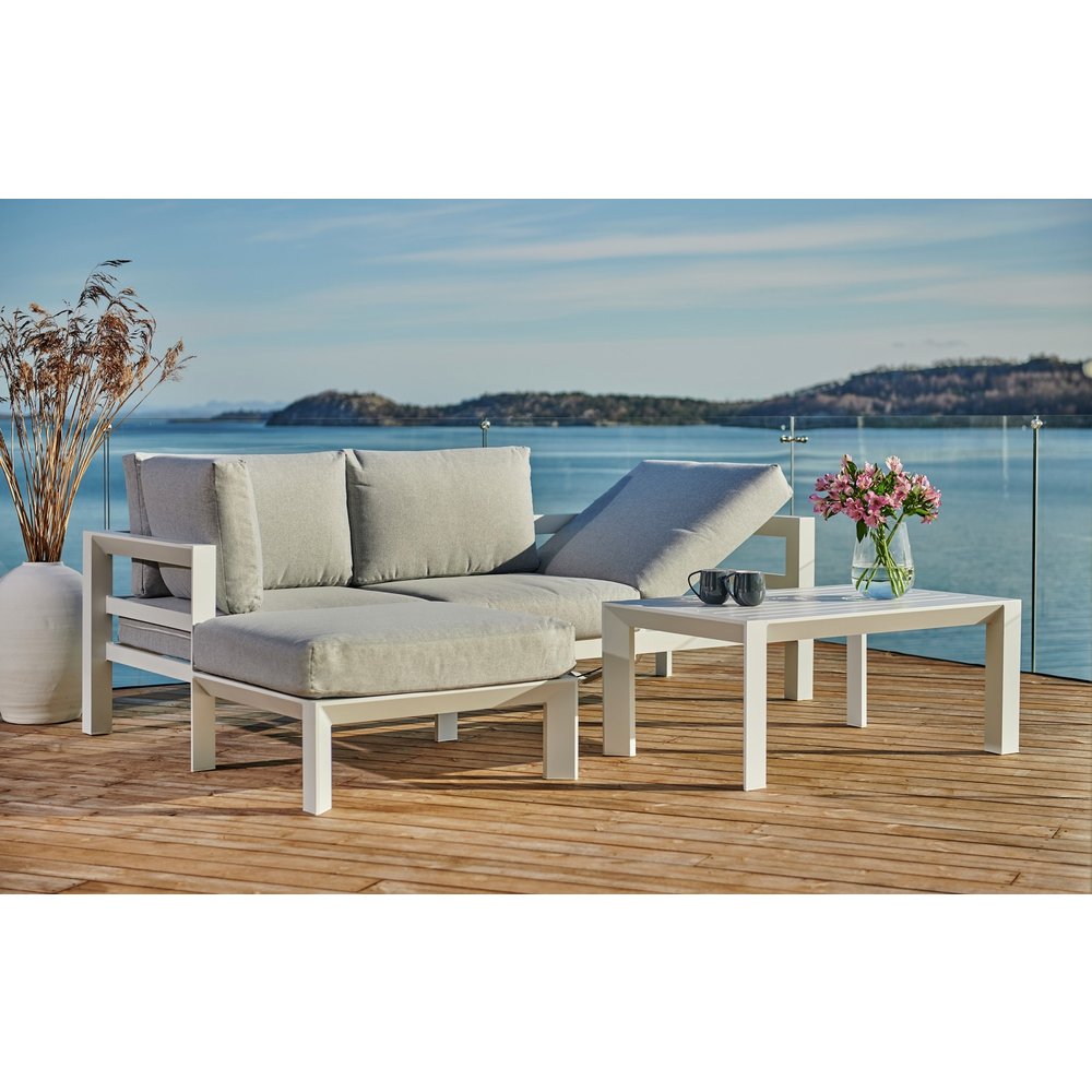 En härlig soffgrupp med en stilren design från Norska kvalitetsmärket Easy Living . Tillverkade i vit aluminium 2,5 sits soffan är väldigt behaglig med en flyttbar divan och ett mysigt litet bord att placera fikan på. Passar perfekt till uteplatsen. Fint ljusgrått tyg på dynorna.