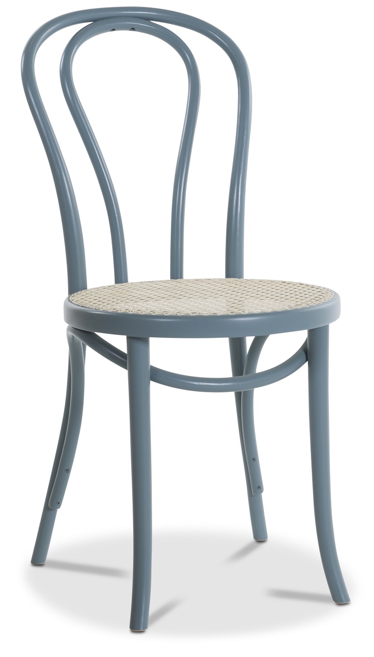 Den klassiska Stolen No 18 i pastellblålackat böjträ med rottingsits! Stolen byggs i Europa utav en av de främsta stolstillverkarna i världen! Högsta kvalitét för både hemmamiljö och offentlig miljö.