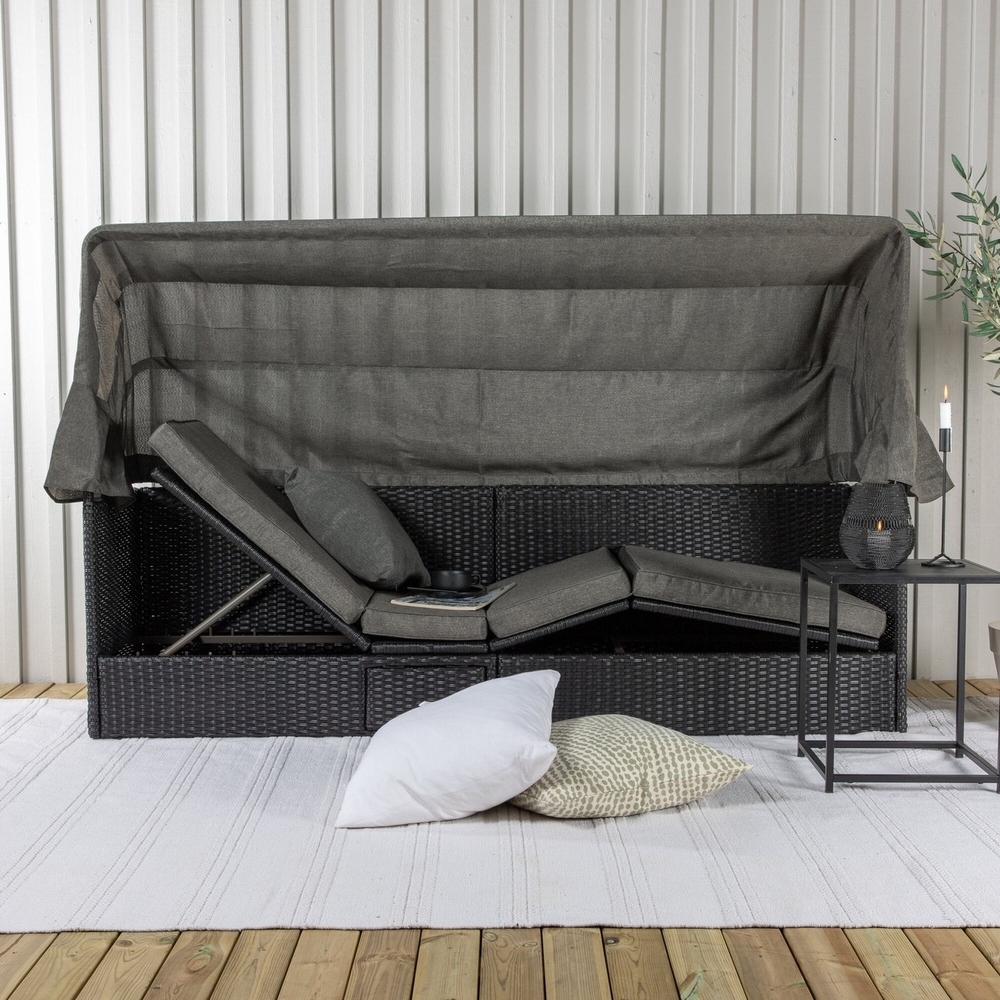 Solsängen från serien Nopy tar dina avkopplande dagar i sommar till nästa nivå! Tillverkad i svart konstrotting med ställbar liggdel för extra komfort. Det justerbara parasollet i grått polyestertyg gör att du enkelt själv kan välja om du vill ligga i skuggan eller solen. Grå pikerade mjuka dynor ingår för extra komfort. Ta fram en bra bok eller njut av en härlig nap - här sitter eller ligger du bekvämt i timmar!