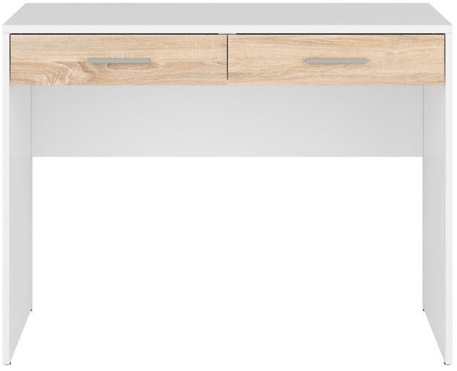 Stilrent skrivbord i vitt med två lådor i ek-imitation för smart förvaring.