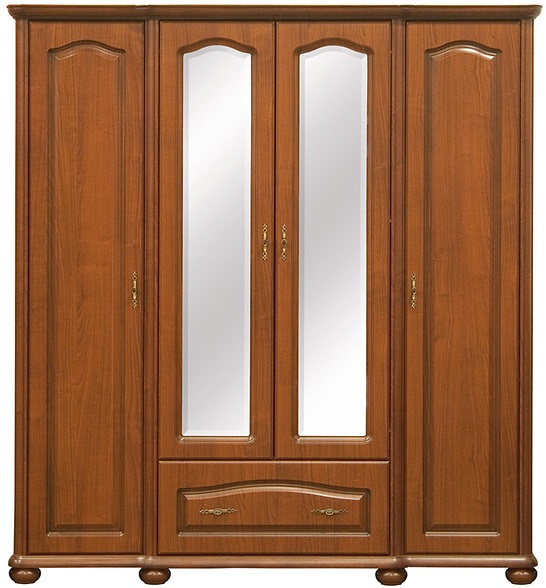 Rymlig garderob i körsbärsimitation med fyra dörrar och en låda. Dörrarna i mitten är i spegel och bakom dessa finns en klädstång. Bakom övriga dörrar finns hyllplan där saker kan förvaras undan.