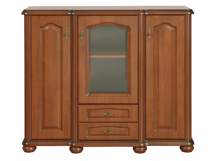 Rymligt skåp i körsbärsimitation med tre skåp och två lådor. Snygga handtag som passar bra ihop med färgen på skåpet.