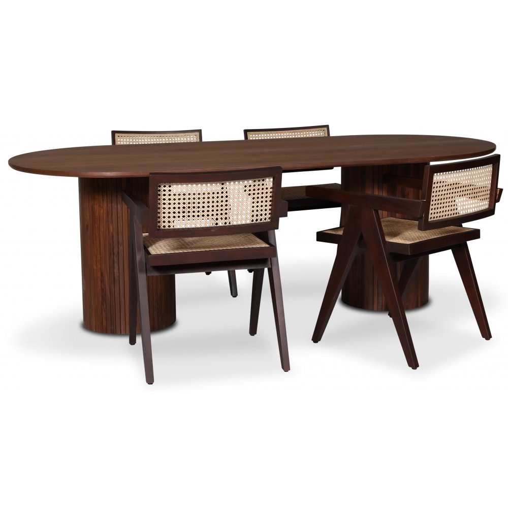 Nova matgrupp från Skånska Möbelhuset, Ovalt matbord, i valnöt med fyra stycken Strömsberg karmstolar i brunlackad mahogny med rotting i rygg och sits.
