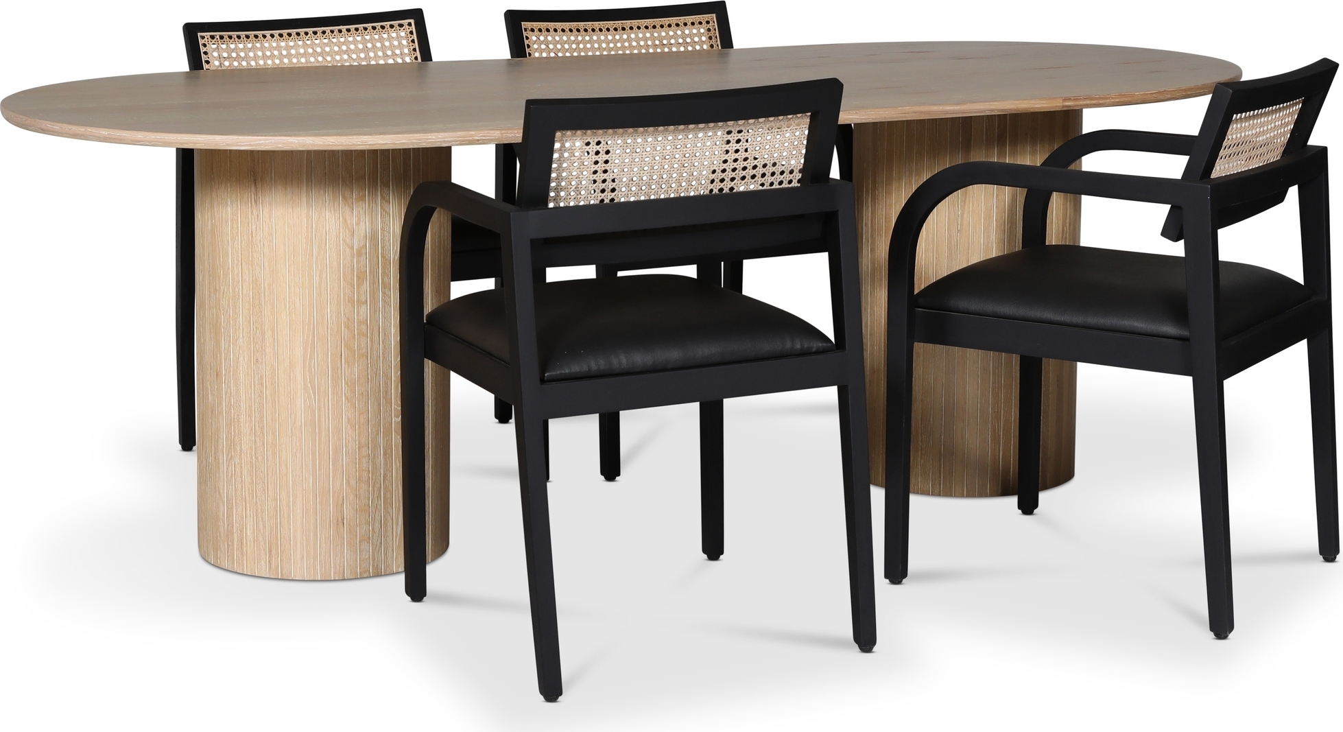 Nova matgrupp från Skånska Möbelhuset, Ovalt matbord, i vitoljad ekfanèr med fyra stycken Siknäs karmstolar i svartbetsad stomme med rotting i rygg och svart PU i sitsen.