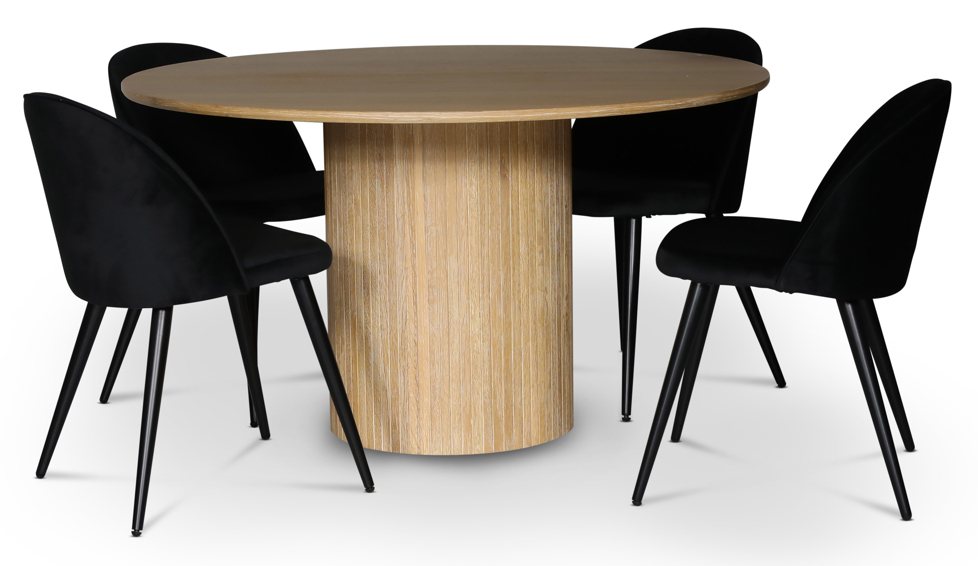 Nova matgrupp från Skånska Möbelhuset, Runt matbord Ø130 cm i diameter, i whitewash ekfanèr med fyra stycken Alice matstolar i svart sammet med svarta metallben.