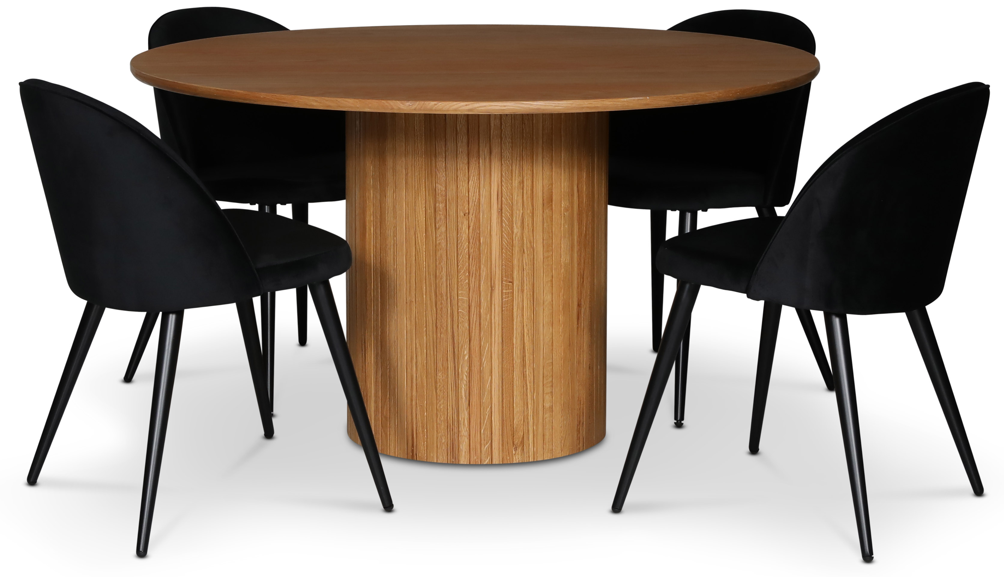 Nova matgrupp; runt matbord Ø130 cm, oljad ek + 4 st Alice matstolar, svart sammet