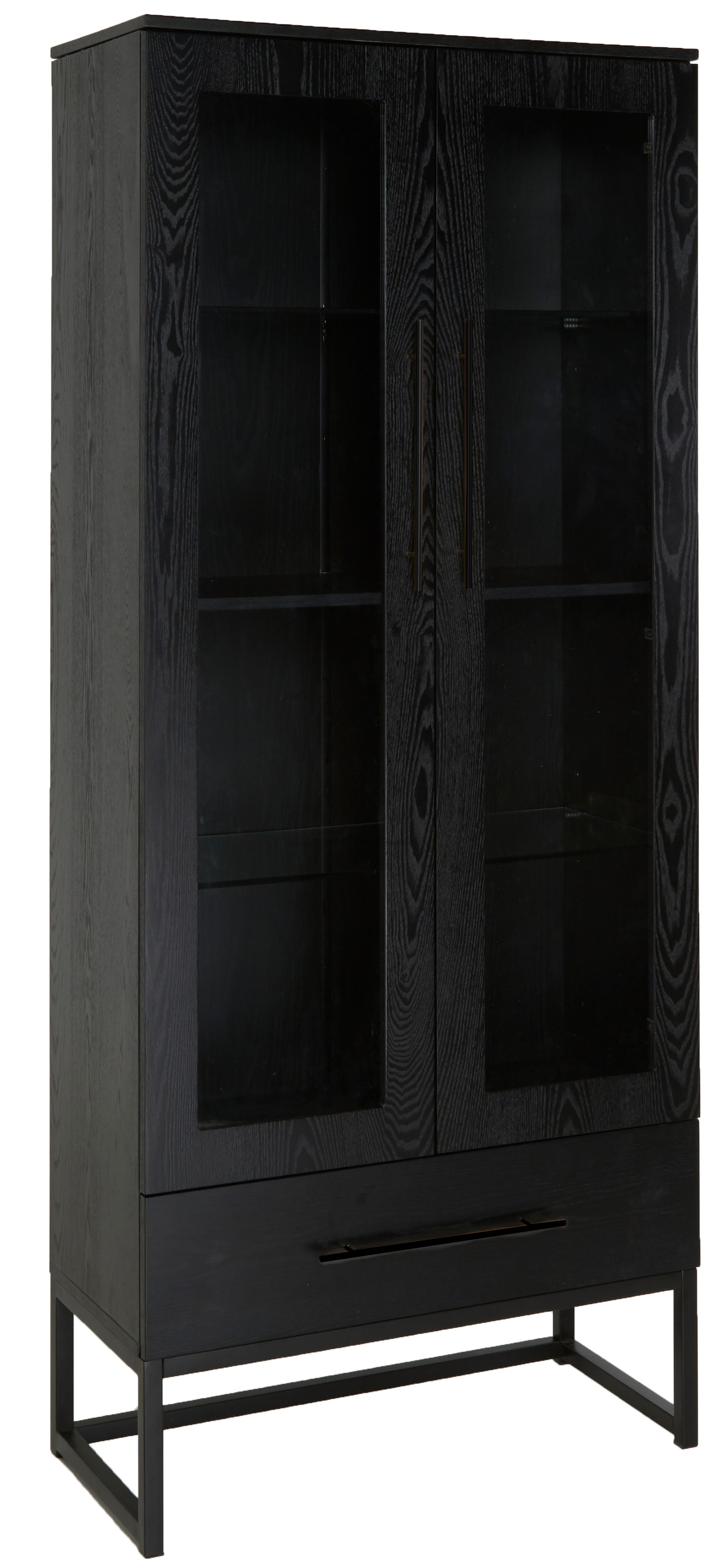 Modernt vitrinskåp i vår serie Novis. Stomme i svartbetsad askfanèr och benen är matt svartlackad metall. Svarta hyllplan för praktisk förvaring.