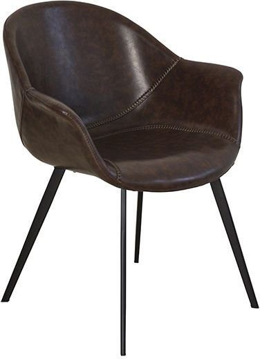 Elegant fåtölj i brun PU med grå kontrastsöm, ben i svartlackad metall.