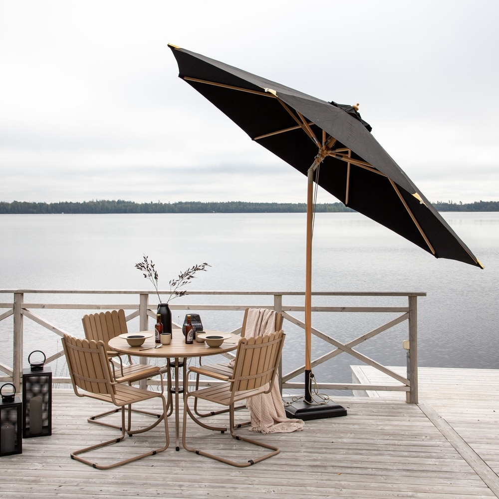 Bjud in familj och vänner till en härlig lunch eller lägg dig och och njut av det fina vädret i skuggan under NYPO - det perfekta parasollet för utemiljön. Parasollet är enkelt att fälla ut och dra ihop, och med det svarta tyget mot ställningen i trä skapas ett modernt och tidlöst uttryck som passar alla hem och stilar. Skötselråd:För våra parasoll rekommenderar vi att man använder sig av parasollskydd. Dra på överdraget när parasollet inte används, det mot sol och minskar därmed risken för solblekning. Överdraget används när parasollduken är torr, annars finns det risk för mögel. Lämna aldrig ett parasoll uppfält när det inte används. Hängparasoll är många gånger känsligare för vindar än vad traditionella parasoll (med pelaren mitt under duken) är.