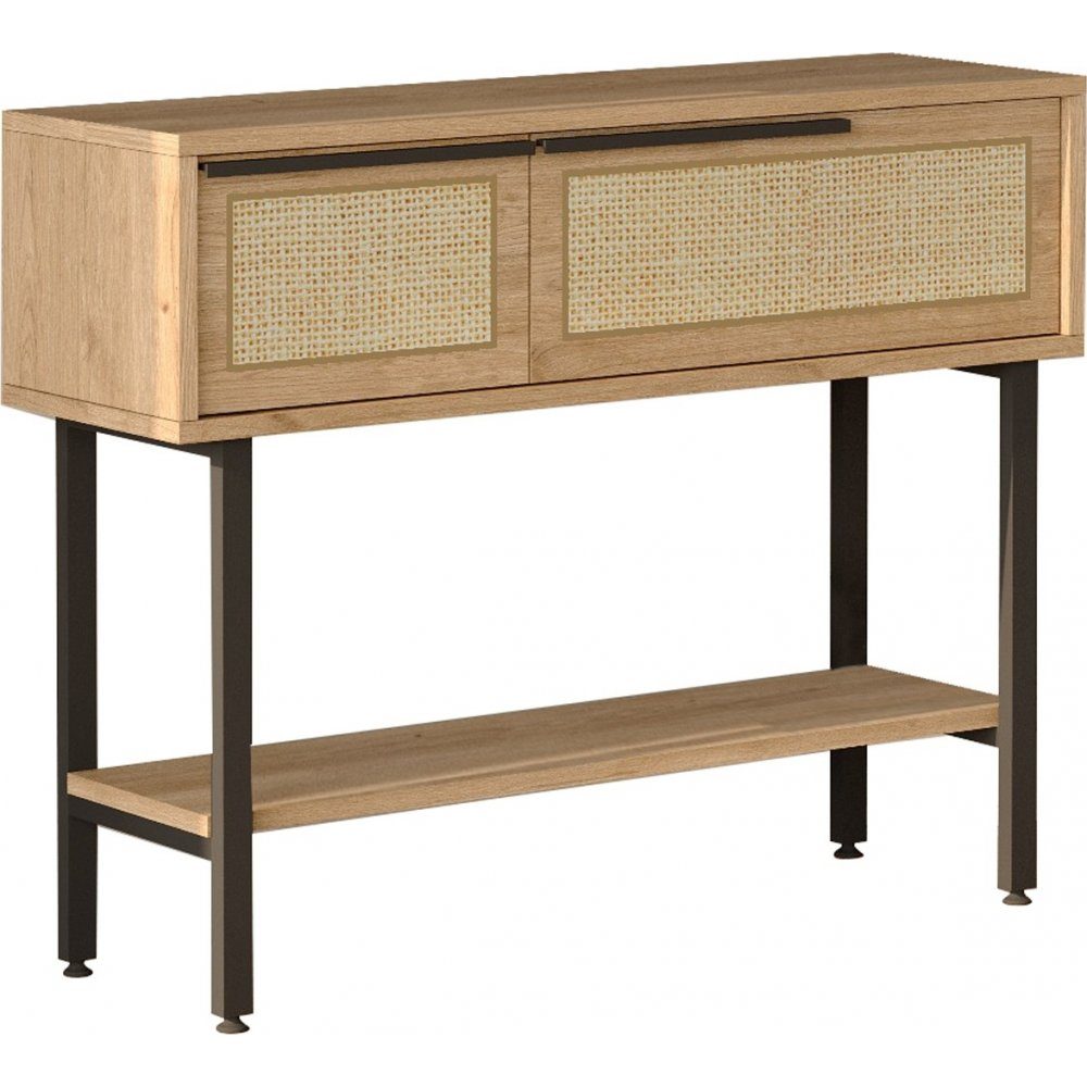 Hallbord av melaminbelagd spånskiva med ben av metall. Med tillhörande väggspegel.