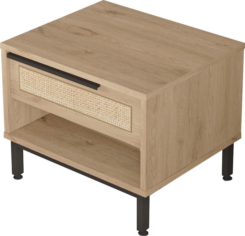 Sängbord av melaminbelagd spånskiva med ben av metall.