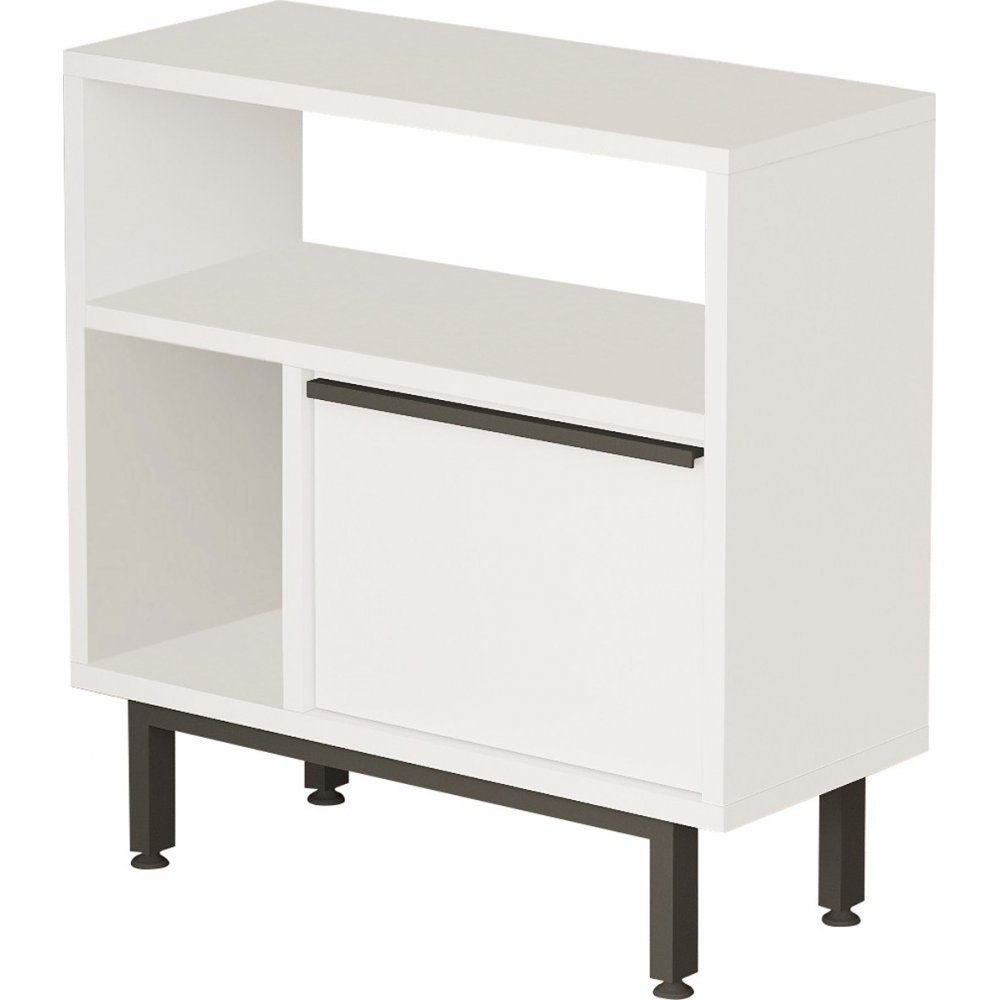Sidobord av melaminbelagd spånskiva med ben av metall.