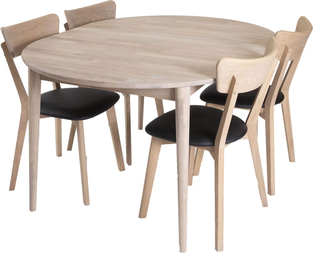 Matgrupp innehållande bord av massiv vitoljad ek med runda ben. Medföljer gör också matchande stolar i vitoljad ek och sits av svart PU.