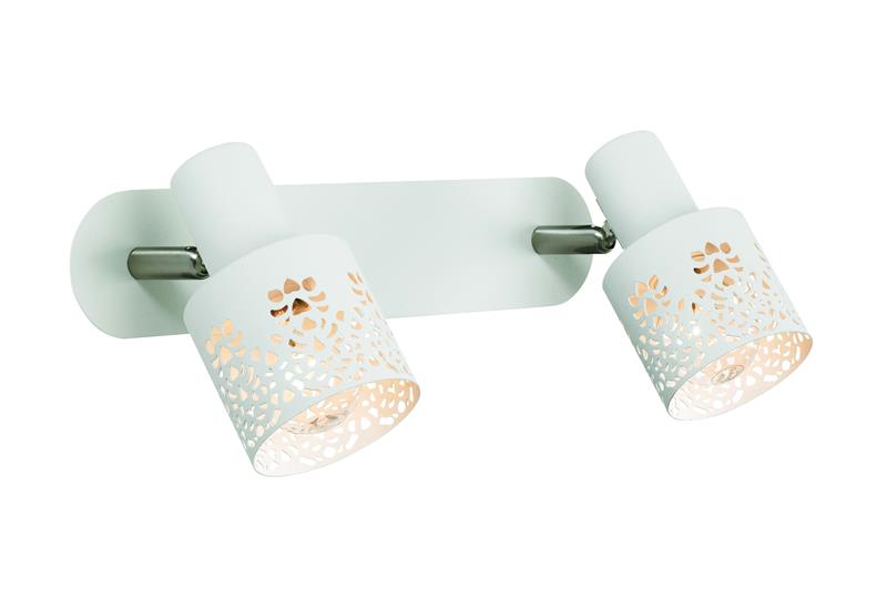 Snygg vägglampa med en stilren design. Tillverkad i vit metall med vackra mönster på skärmarna. 2 meter sladd med strömbrytare på sladden. Liten lamphållare (E14). Max 40W glödljus eller motsvarande styrka i halogen, lågenergi eller LED. Lampan är lättplacerad och passar perfekt in på flera olika platser i hushållet.