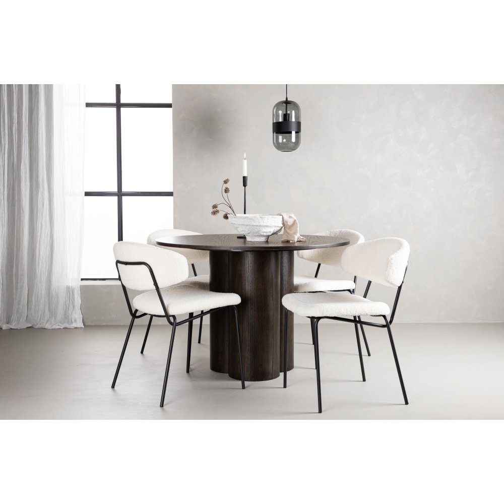 Matbord Olivia har en stilren Skandinavisk design med en rund toppskiva i MDF i en smakfull mocca-färg och tre cylinderformade ben samlade under bordets mitt. Bordet kombineras här med de trendiga Chico matstolarna, som har en minimalistisk design med sits och rygg i vitt boucletyg och en smal stomme i svart stål. Tillsammans skapar de ett inbjudande och modernt blickfång för ditt hem.