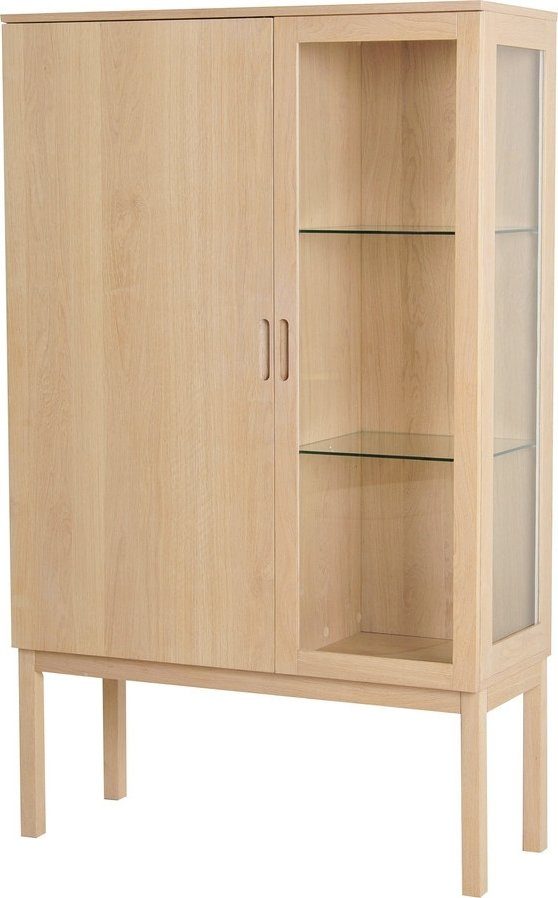 Vitrinskåp av ek med LED-belyst förvaring bakom glasdörr.