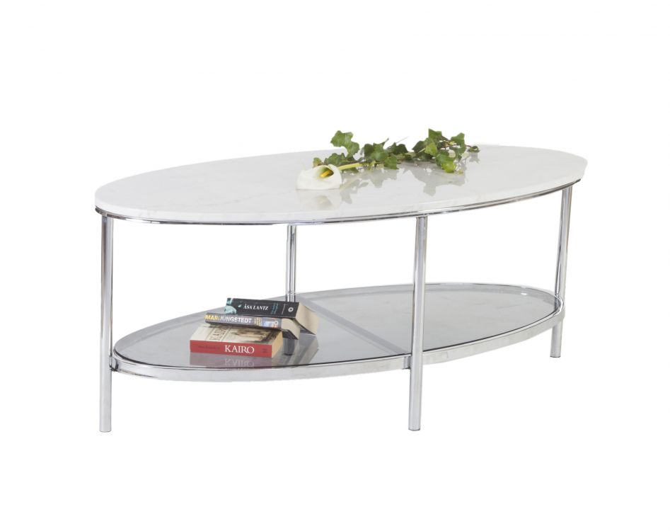 Elegant och stiligt ovalt soffbord med vit marmorskiva och underrede i krom.