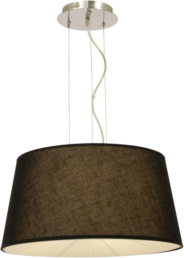 Taklampa med svart textil skärm. Platta i kromad metall. Lätt upphängning i tak.
