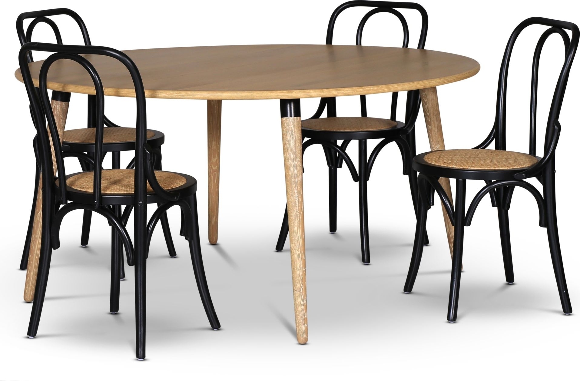 Matgrupp innehållande Omni matbord, serie runda matbord med toppskiva av ekfaner i olika utförande med matchande ben. Ett stilrent och nätt matbord. Ingår gör även 4 st Tony stolar med stomme av svart massiv bok och sits av antikfärgad rotting. Teknik för att böja träet har använts i designen.