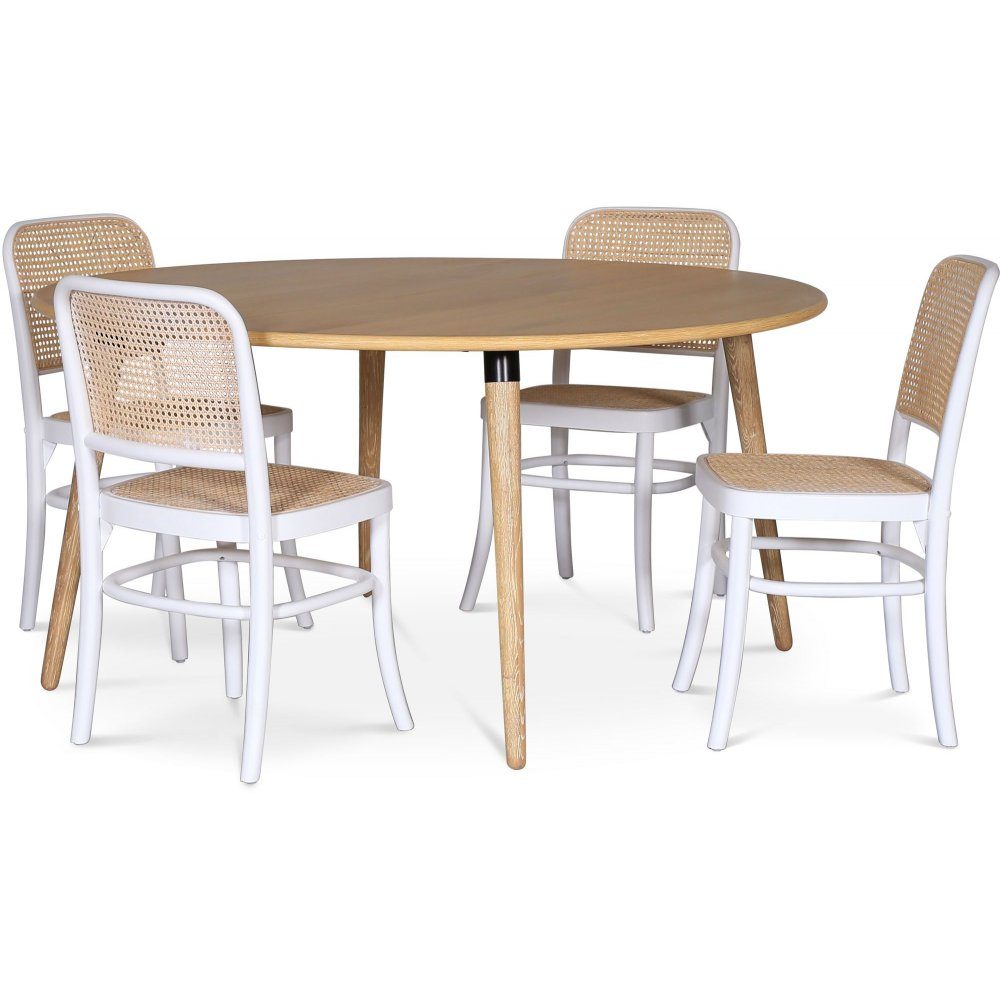 Matgrupp innehållande Omni matbord, serie runda matbord med toppskiva av ekfaner i olika utförande med matchande ben. Ett stilrent och nätt matbord. Ingår gör även 4 st Tyko stol med stomme av massiv bok i vitt utförande, sits- och rygg av naturfärgad rotting. En snygg kombination som passar det moderna hemmet.