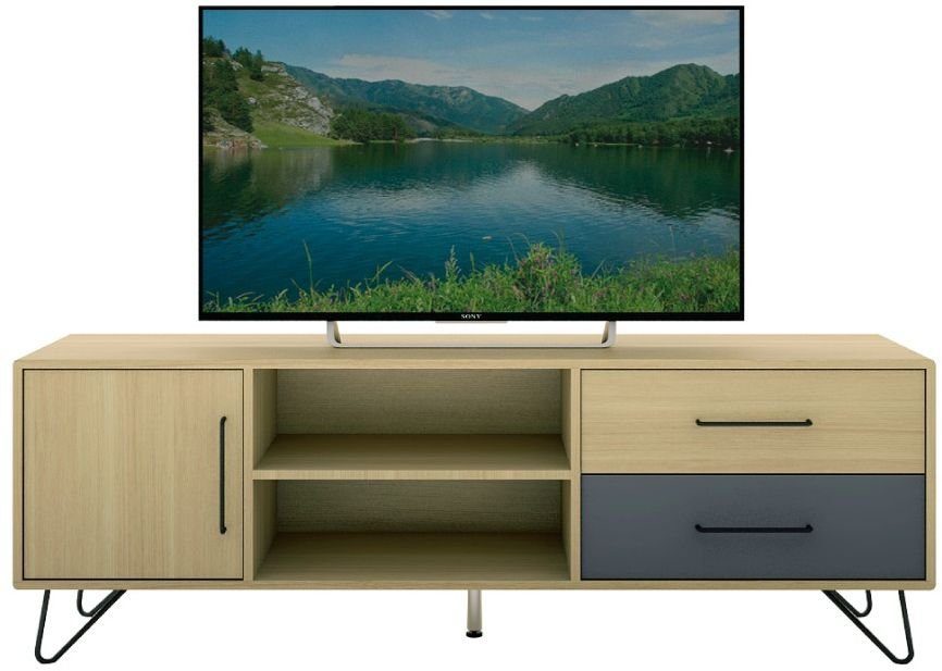 Snygg TV-bänk med praktiskt förvaring i form av två hyllor för t.ex elektronik, två låda och ett skåp. Passar perfekt in i vardagsrummet.