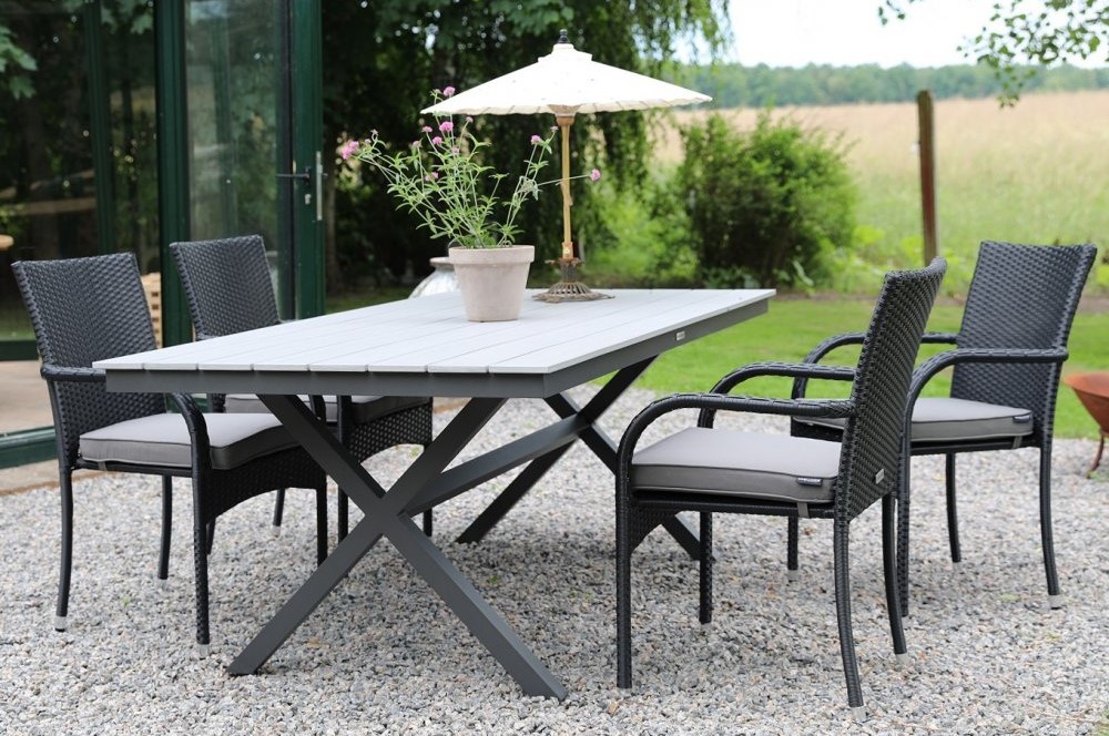 Matstolen Orissa är en välbyggd stol i svart konstrotting på aluminiumstomme, stolen är stapelbar och därmed praktiskt att förvaring.