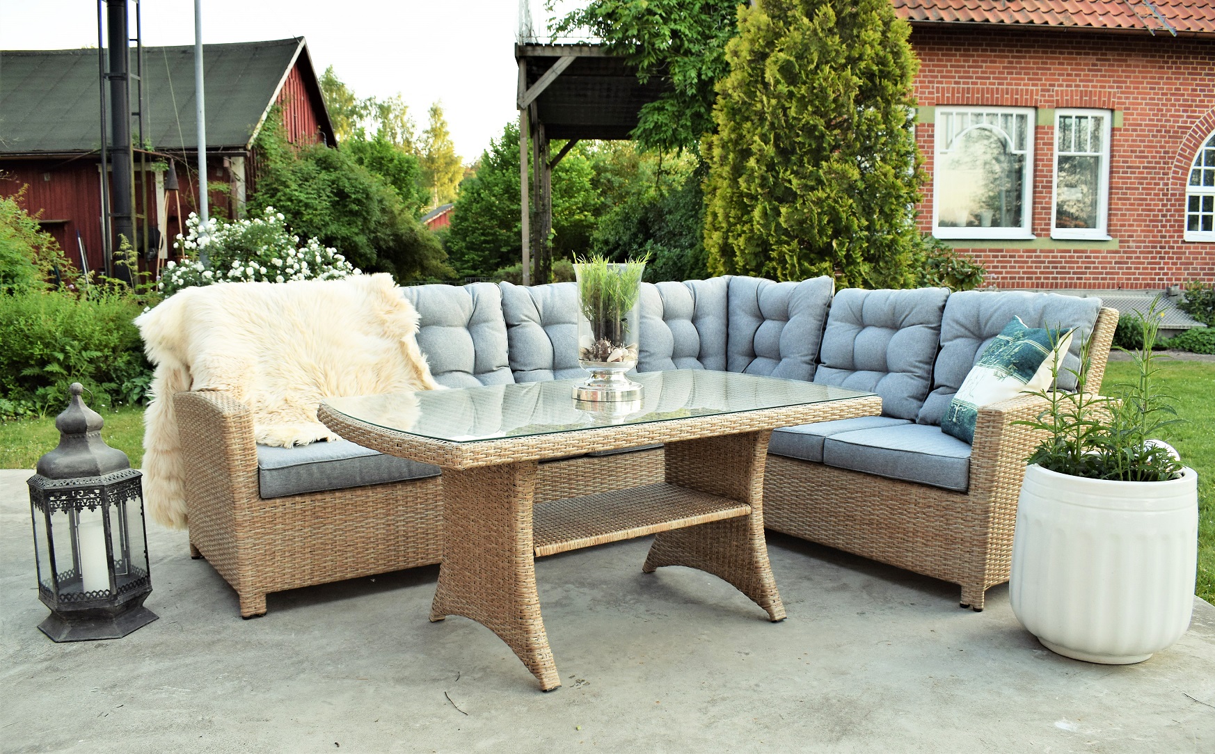 Orlando hörnsoffgrupp höger ger dig en utemöblegrupp i klassisk natur konstrottingdesign med gott om plats. Bord och soffa i matchande naturfärgad konstrotting, hållbar ram i aluminium som klarar utemiljö. Bord med glasskiva för enkel rengöring. Innehåller 1 st hörnsoffa soffa samt matbord. Material aluminium, konstrotting och glas.