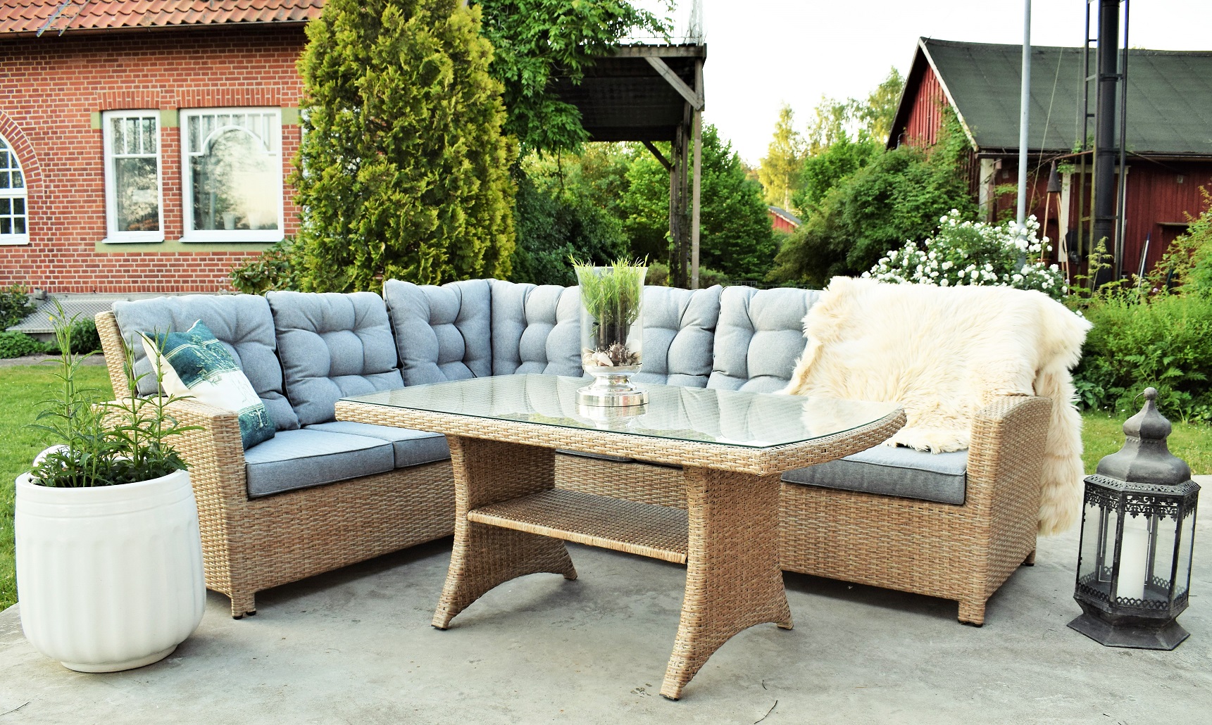 Orlando hörnsoffgrupp vänster ger dig en utemöblegrupp i klassisk natur konstrottingdesign med gott om plats. Bord och soffa i matchande naturfärgad konstrotting, hållbar ram i aluminium som klarar utemiljö. Bord med glasskiva för enkel rengöring. Innehåller 1 st hörnsoffa samt matbord. Material aluminium, konstrotting och glas.