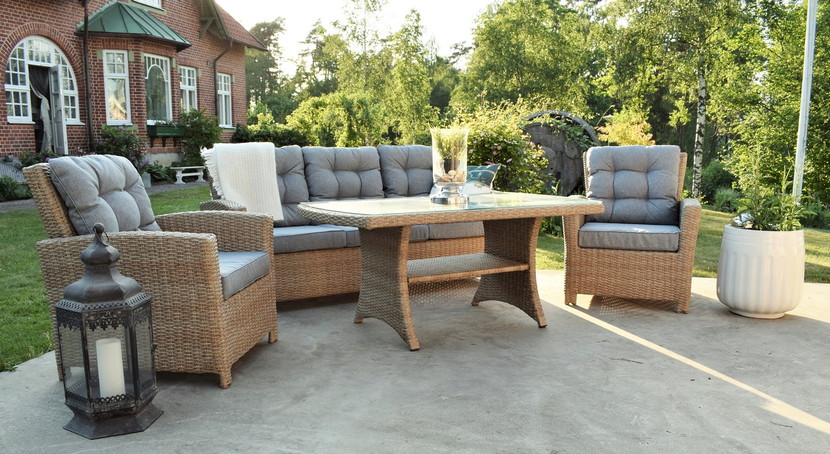 Orlando ger dig en utemöblegrupp i klassisk natur konstrottingdesign med gott om plats. Bord och stolar i matchande naturfärgad konstrotting, hållbar ram i aluminium som klarar utemiljö. Bord med glasskiva för enkel rengöring. Innehåller 1 st 3-sits soffa, 2 st fåtöljer samt matbord. Material aluminium, konstrotting och glas.