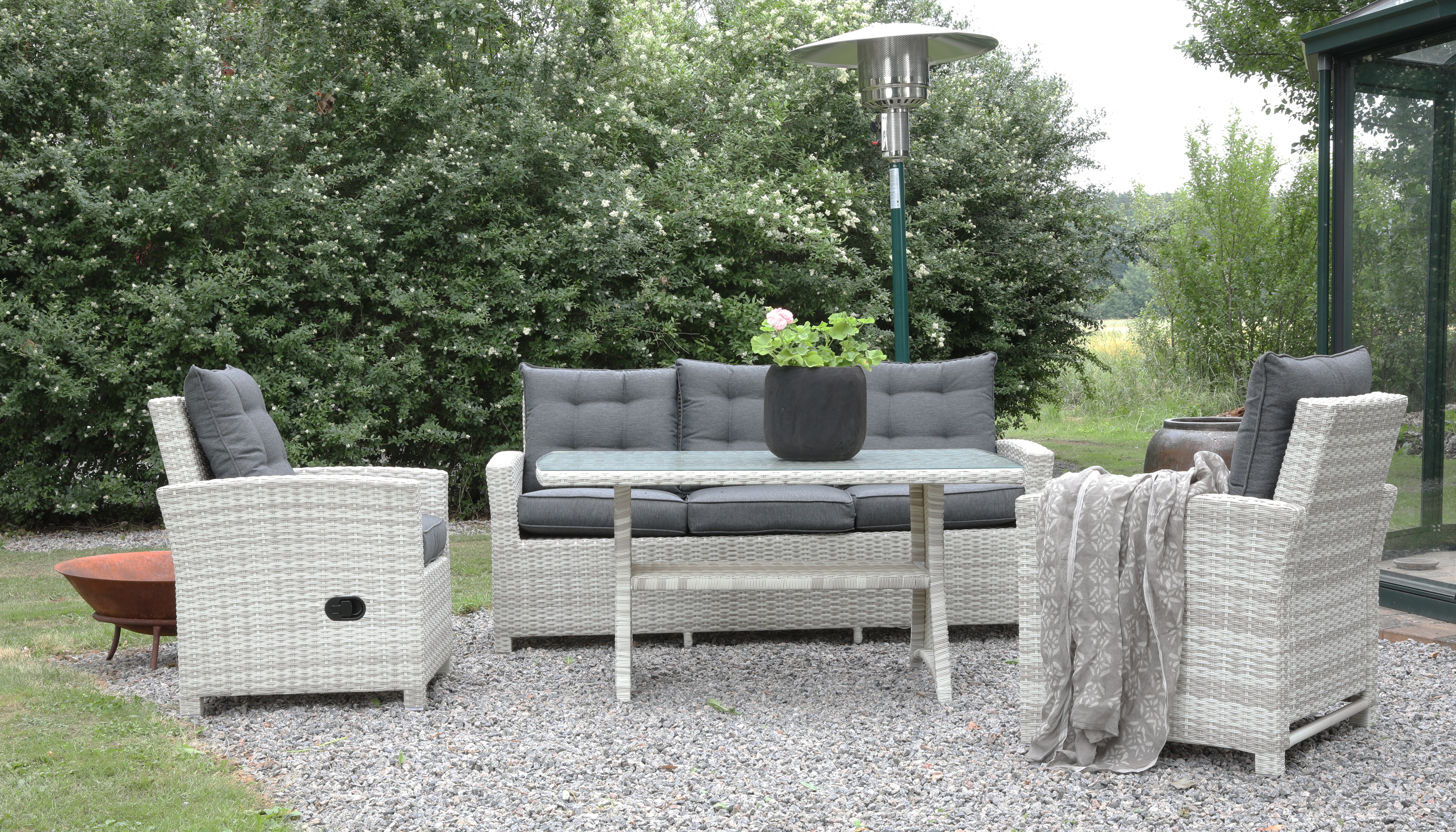 Orlando ger dig en utemöblegrupp i klassisk konstrotting i ljust och fräscht utförande. Möbelgruppen består av bord, soffa och två fåtöljer som är ställbara. Materialen är hållbar ram i aluminium som klarar utemiljö med dubbelvävd halvrund konstrotting. Bord med glasskiva för enkel rengöring. Hög rygg och ställbar för att få så bra komfort som möjligt.