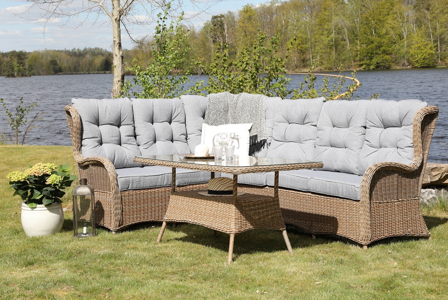 Orleans ger dig en utemöblegrupp i klassisk naturfärgad konstrotting. Möbelgruppen består av bord och hörnsoffa med tillhörande ljusgråa dynor. Materialen är hållbar ram i aluminium som klarar utemiljö med dubbelvävd halvrund konstrotting. Bord med glasskiva för enkel rengöring.