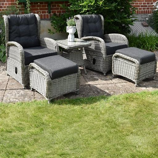 Fåtöljset Orleans Highback med två ställbara fåtöljer, tillhörande fotpallar samt ett nätt bord, allt i gråmelerad konstrotting. Passar bra för avkoppling ute på uteplatsen, terrassen etc. Inklusive grå dynor. Dubbelflätad halvrund rotting. Ljusgråa dynor som är välarbetade med passpoal.