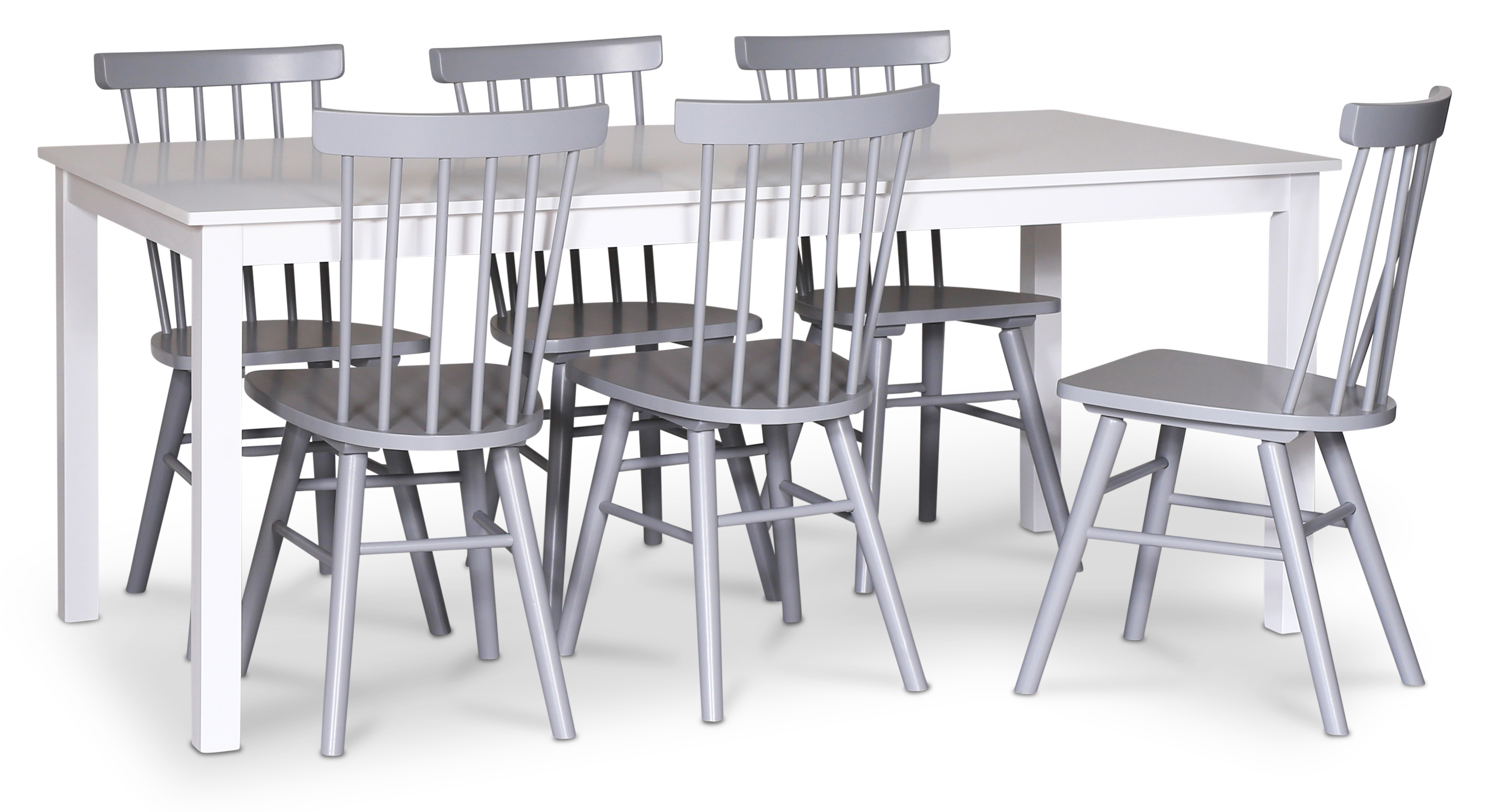 Orust matgrupp; matbord 180x90 cm med 6 st gråa Orust pinnstolar