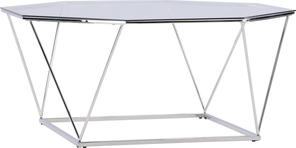 Upptäck skönheten i detta eleganta soffbord som är tillverkat i glas med en silvrig stålram, vilket ger det en modern och lyxig touch. Soffbordets form med åtta kanter skapar en unik och intressant design som blir en iögonfallande mittpunkt i ditt vardagsrum eller loungeområde. Det här bordet är inte bara en vacker inredningsdetalj, det är också mycket praktiskt. Med sin silvriga stålram ger soffbordet en tidlös elegans till vilket rum det än placeras i. Det är en perfekt kombination av stil och hållbarhet, och kommer att vara en pålitlig följeslagare under lång tid framöver. Levereras omonterad.