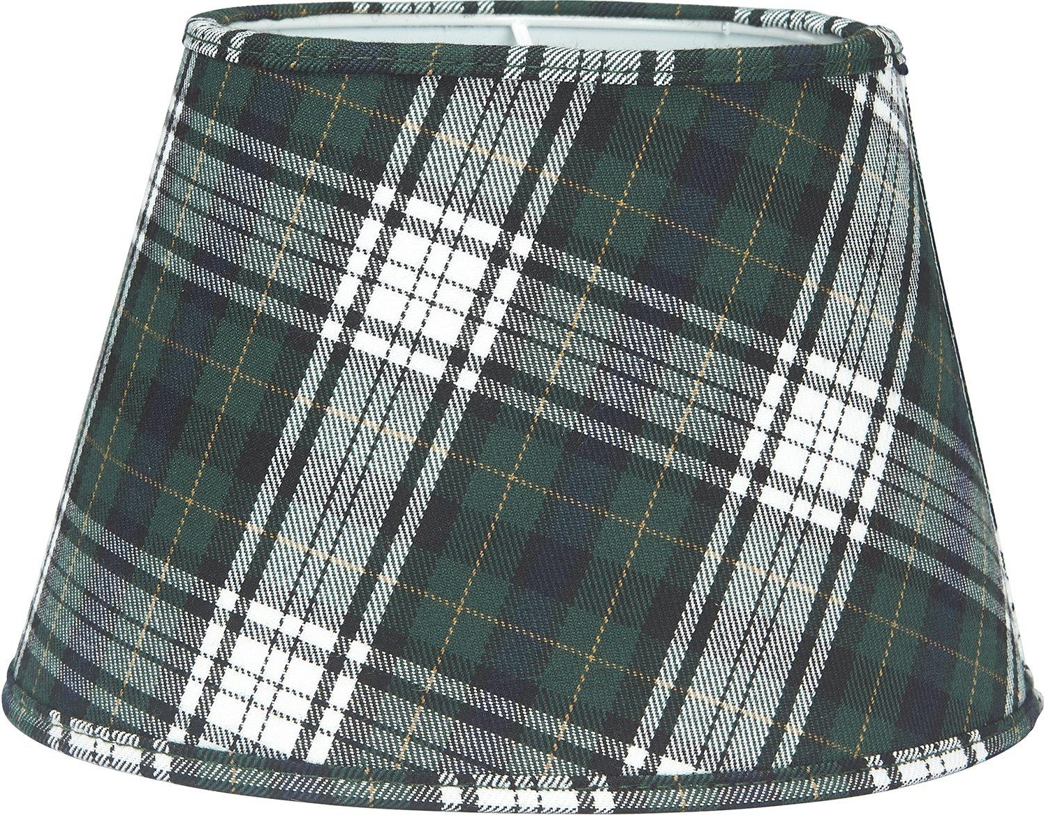 Oval Lampskärm i ett rutigt tyg. Lampskärmen har en ljus insida och ett klofäste som fästes direkt på ljuskällan. Använd en klotformad ljuskälla E27.