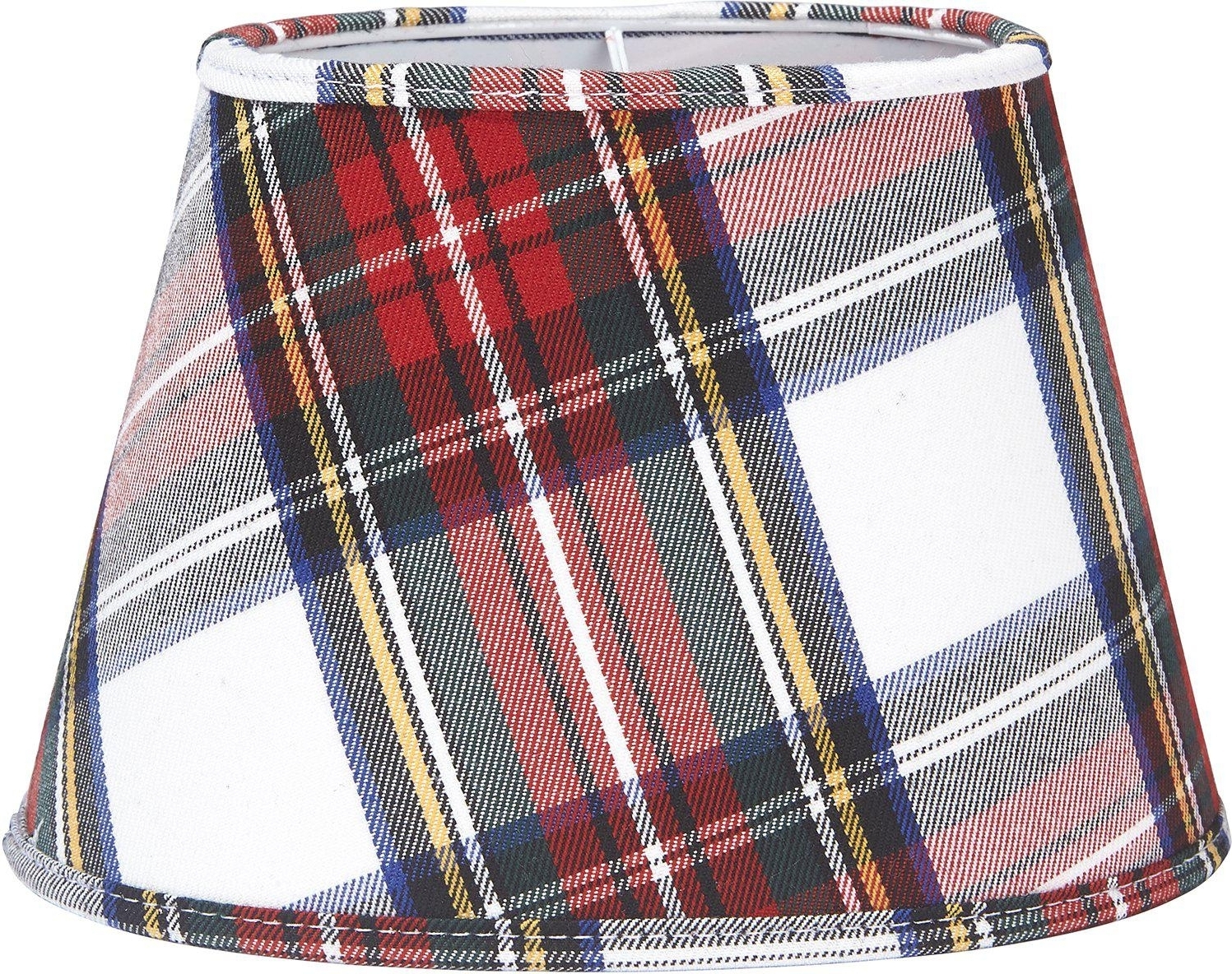 Oval Lampskärm i ett rutigt tyg. Lampskärmen har en ljus insida och ett klofäste som fästes direkt på ljuskällan. Använd en klotformad ljuskälla E27.