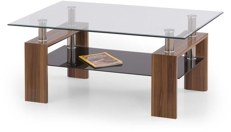 Snyggt soffbord med en moder design. Underredet är tillverkat i MDF med snyggt valnöt laminat och med detaljer i kromad metall. Bordsskivan är i härligt klarglas med en praktisk underhylla i svart glas för smart förvaring.