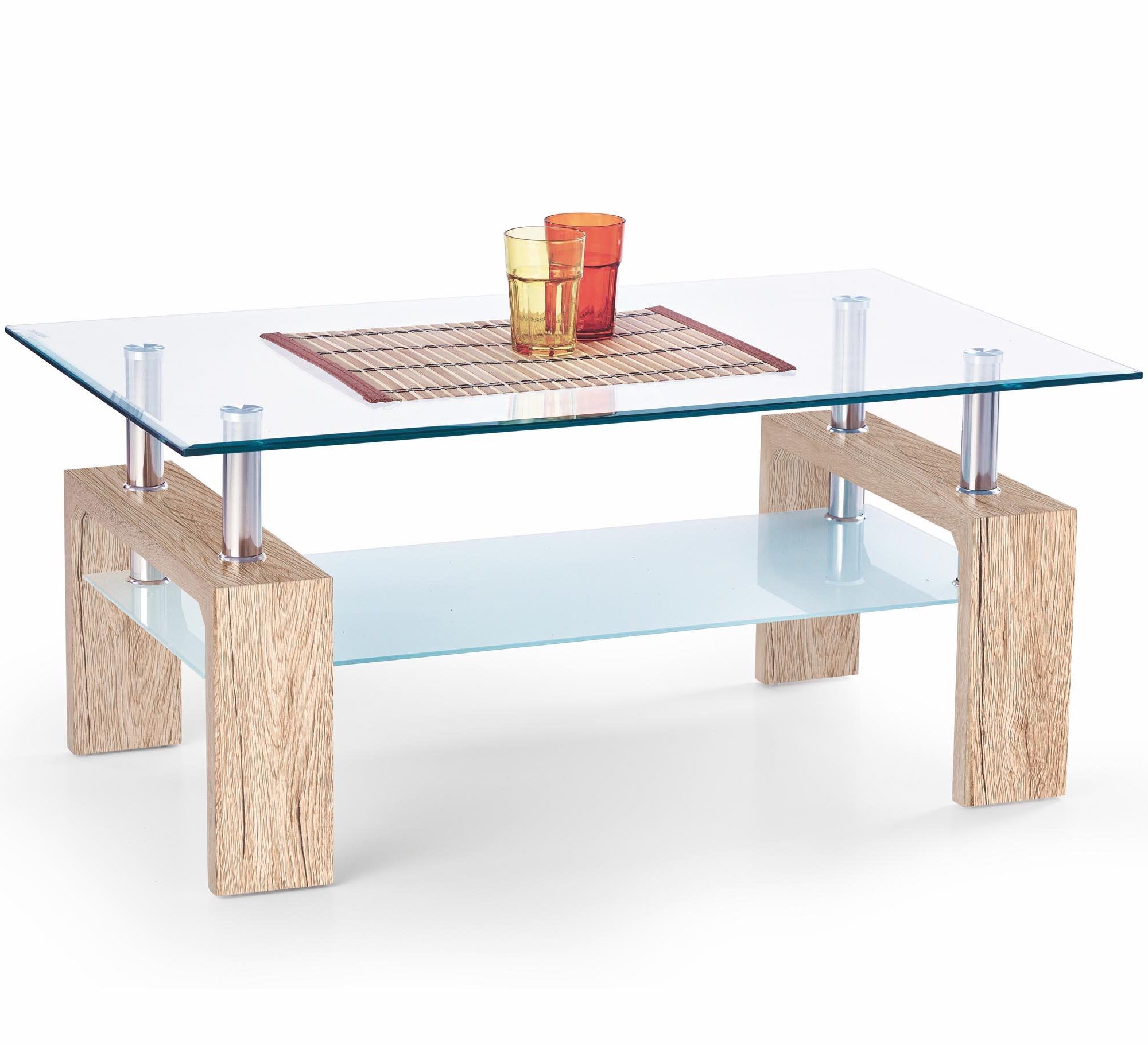 Ett härligt soffbord med en modern design. Bordsskivan är tillverkad av mycket tåligt klarglas med en praktiskt underhylla för smart förvaring och underredet är av laminerad MDF med detaljer i kromad metall.