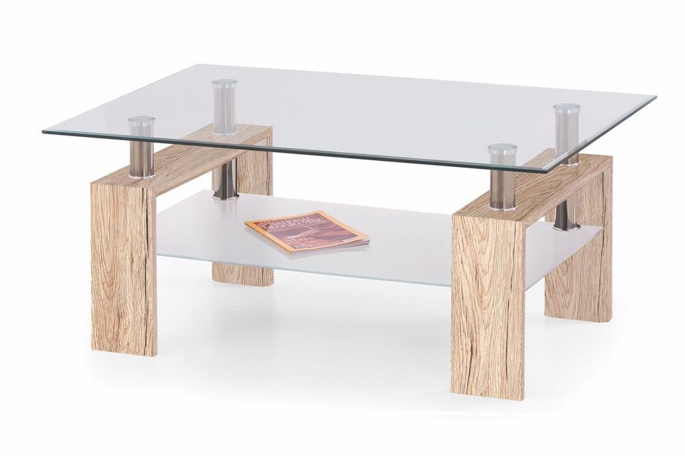Ett snyggt soffbord med en modern design. Bordsskivan är tillverkad av mycket tåligt klarglas med en praktiskt underhylla i frostat glas för smart förvaring och underredet är av laminerad MFP (premium träskiva) med detaljer i kromad metall.