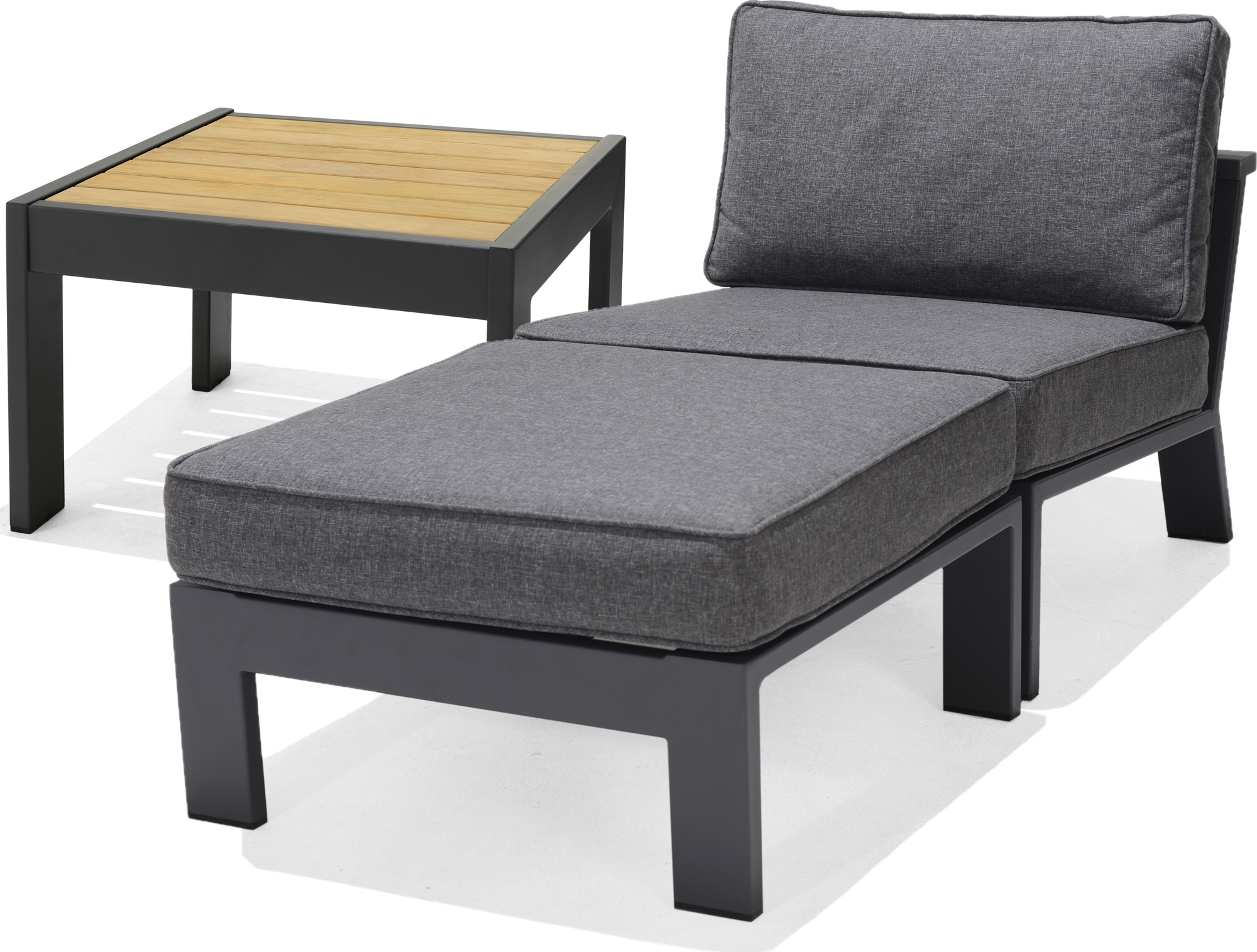 Loungegrupp med 1 st fåtölj utan armstöd, 1 st fotpall och 1 st sidobord. Tillverkat av rostfri aluminium och FSC™märkt teak. Dynor av olefin.