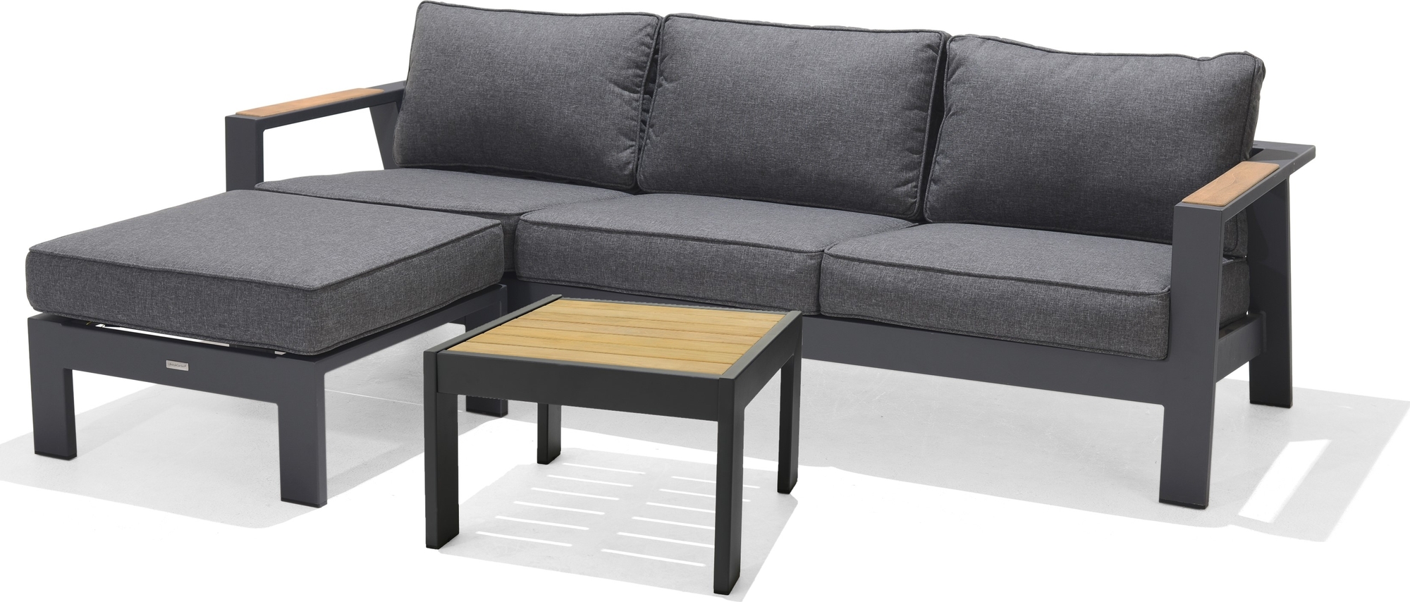 Loungegrupp med 1 st 3-sits soffa, 1 st fotpall och 1 st sidobord. Tillverkat av rostfri aluminium och FSC™märkt teak. Dynor av olefin.