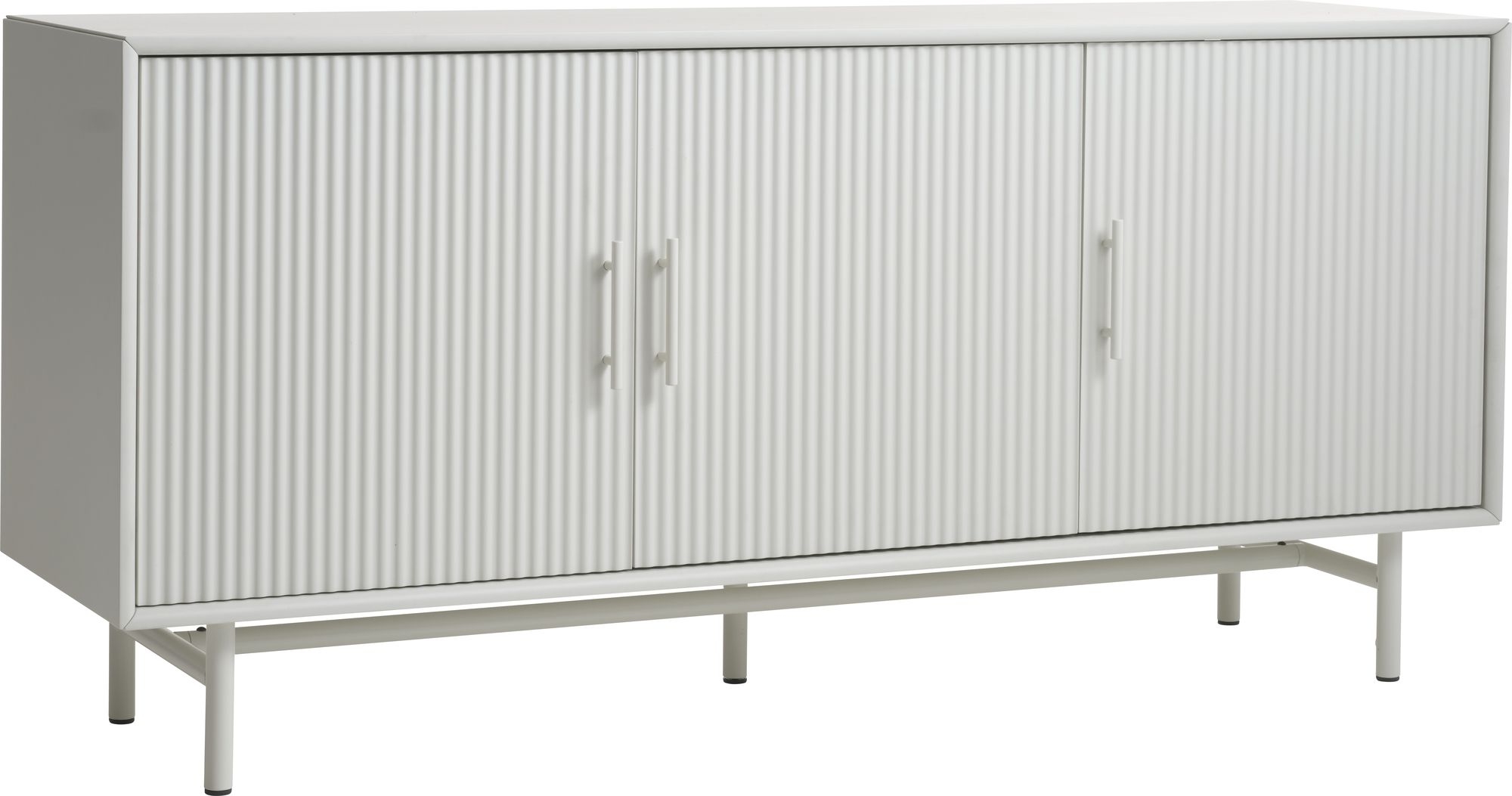 Skänken har tre dörrar och lika många hyllor med gott om utrymme för att organisera allt från serviser till böcker och prydnadsföremål. Den rektangulära formen och den vita kulören gör att skänken utstrålar en lugn och ren estetik. Det ståtliga metallhandtaget och metalldetaljerna på skänkens ben ger en industriell touch som kompletterar den annars klassiska vita looken. Med ett avstånd från golv till botten på 18 cm finns det även plats för enkel rengöring under möblerna.