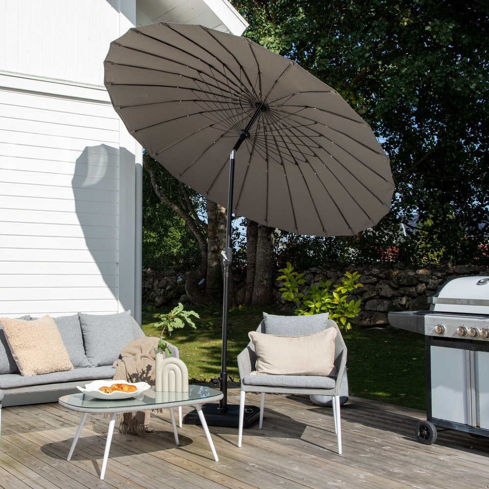 Rama in din utemiljö med Palmetto - ett parasoll i en modern stil som passar både till utemöblerna vid uteplatsen och bredvid solstolen. Flytta parasollet till den plats som passar dig när du vill svalka dig i skuggan ett tag!Mått 270 cmSkötselråd:För våra parasoll rekommenderar vi att man använder sig av parasollskydd. Dra på överdraget när parasollet inte används, det mot sol och minskar därmed risken för solblekning. Överdraget används när parasollduken är torr, annars finns det risk för mögel. Lämna aldrig ett parasoll uppfält när det inte används. Hängparasoll är många gånger känsligare för vindar än vad traditionella parasoll (med pelaren mitt under duken) är.