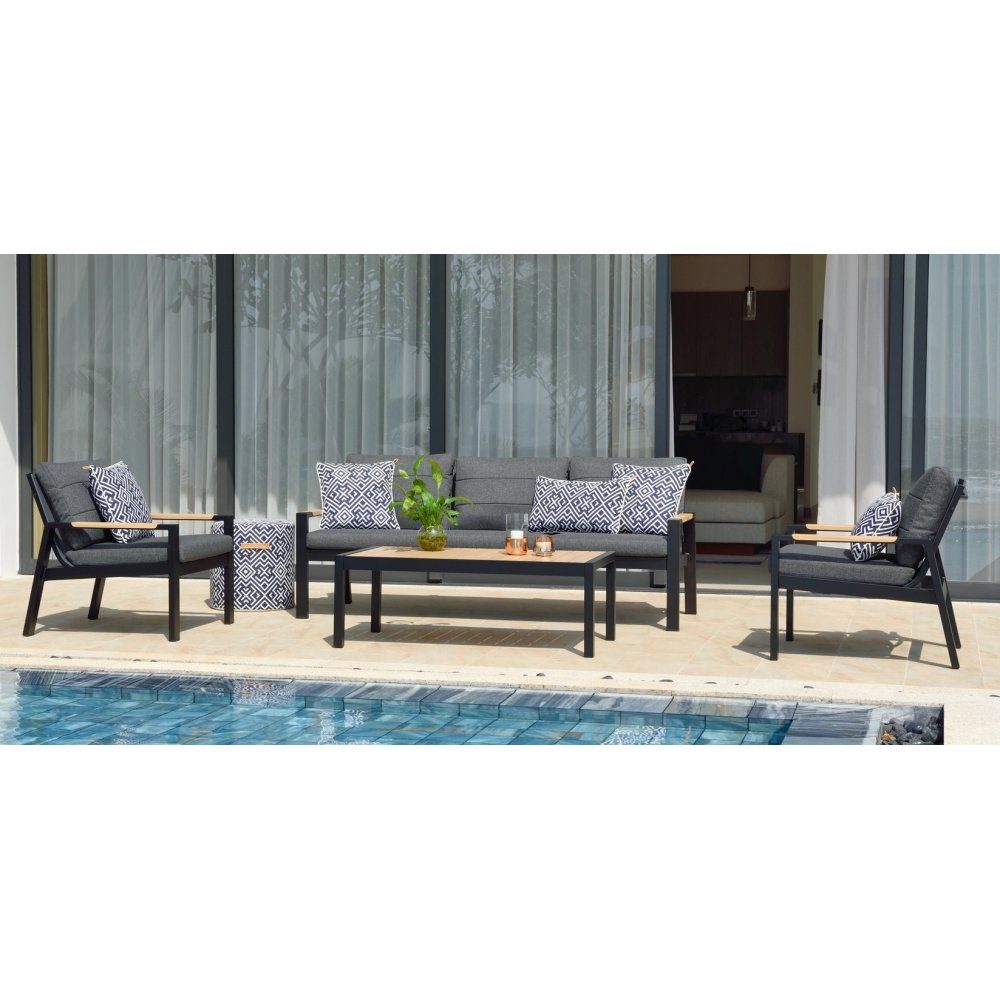 Den populära serien från LifestyleGarden® är en modern och snygg kollektion bestående av möbler tillverkade i helt underhållsfri aluminium. På så sätt får du mer tid att njuta av möblerna. Stommen består av pulverlackerad aluminium med armstöd och bordstopp med printad naturfärgad trästruktur. Pulverlackering är ett miljövänligt sätt att lackera möbler på och garanterar en lång livstid. Dynor med Olefin® premiumtyg. Välj en skön soffgrupp eller praktisk matgrupp med de moduler som passar utifrån dina behov. Med seriens olika tillbehör kan du skapa en enhetlig uteplats som har alla de funktioner och möjligheter som just du önskar dig.