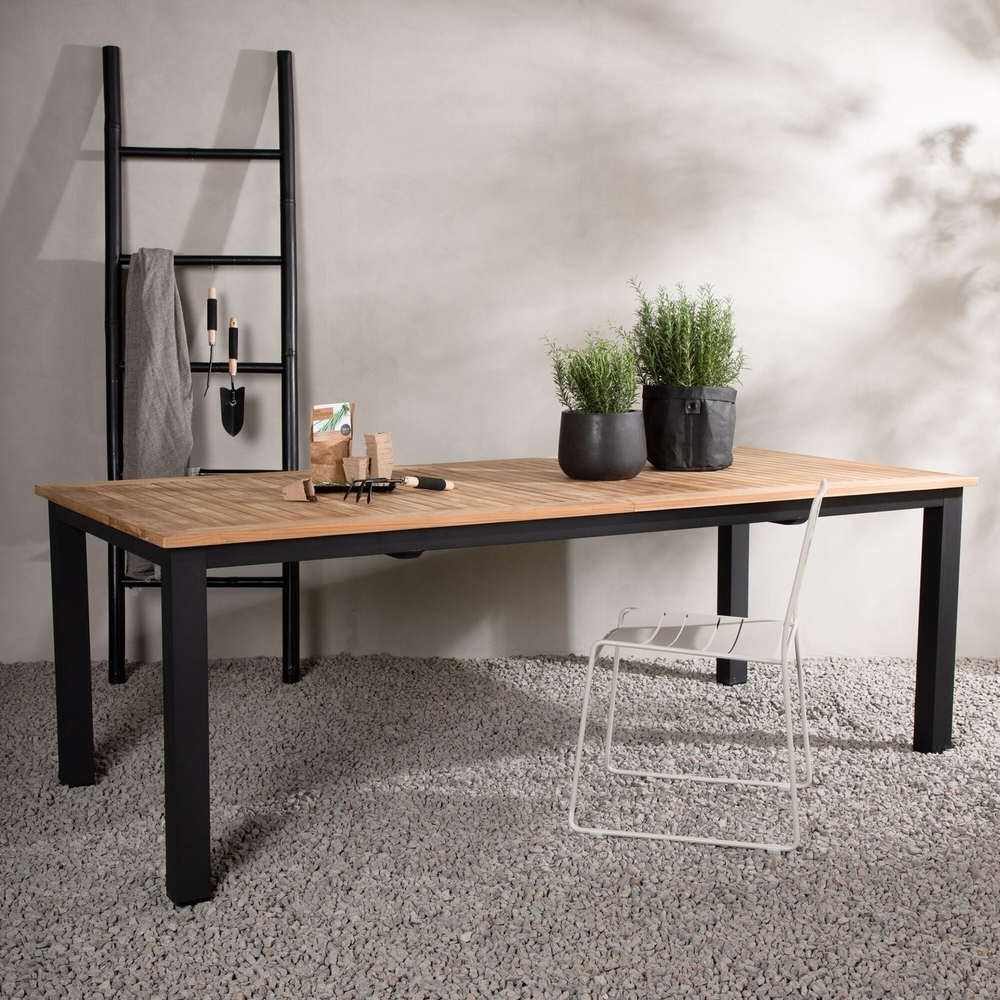 Panama, vårt förlängningsbara matbord i en rektangulär form som passar utmärkt till både små och stora sällskap! Bordsskivan är i teak och underredet i svart metall - en läcker färgkombination som står sig över tid. Samla familj och vänner för härliga middagar i sommarsolen och gör er redo för utelivet! Skötselråd: Våra teakmöbler produceras av certifierad teak som är odlad för ändamålet och inte skövlade från ömtålig regnskog. Som ett av de tåligaste träslagen innehåller teak mycket olja som sedvanligt behövs för att inte materialet ska spricka. Eftersom träslaget innehåller naturligt mycket behöver inte möblerna impregneras lika ofta.