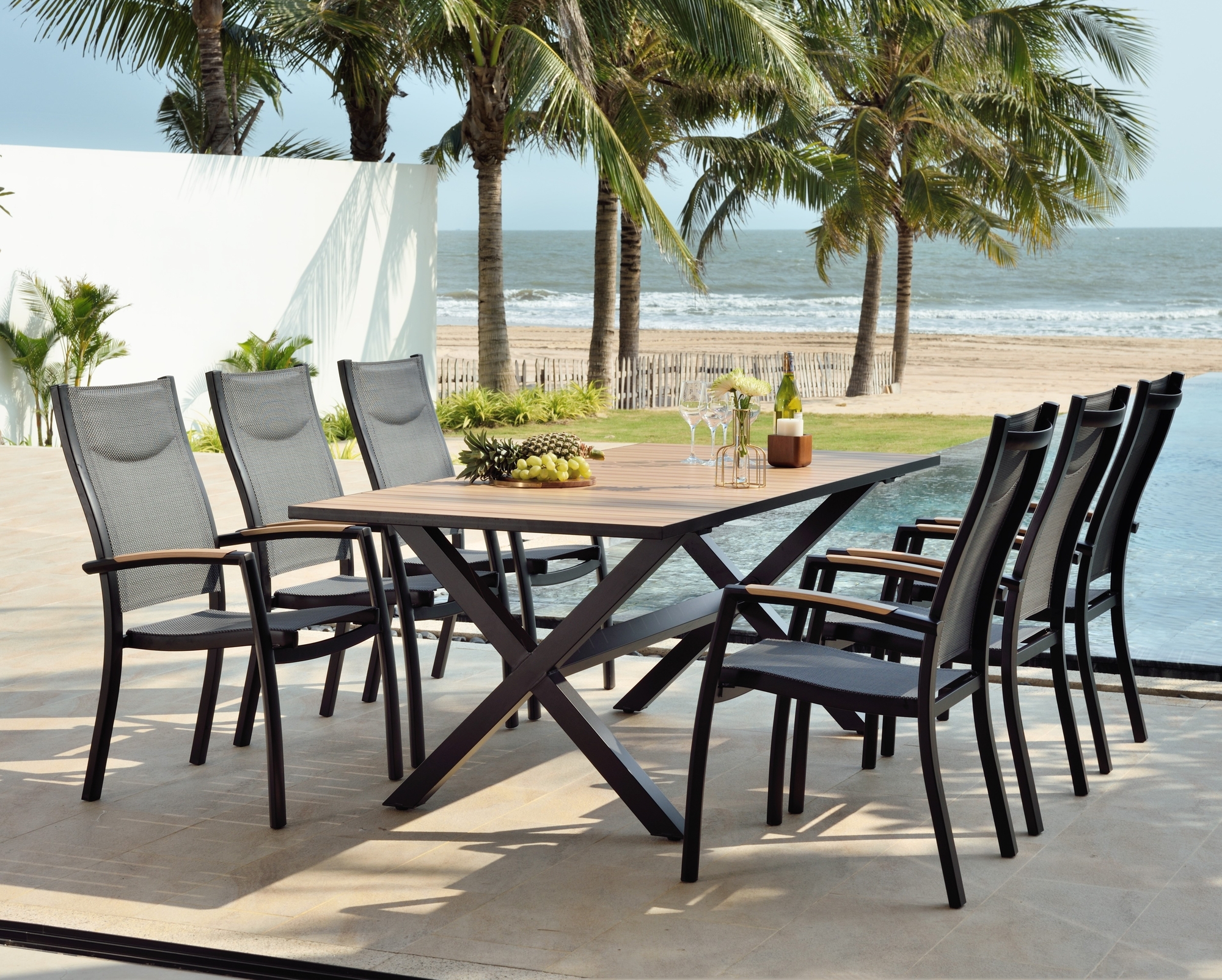 Matgrupp med 1 st 200 cm:s matbord med kryssben och 6 st staplingsbara matstolar. Tillverkat av rostfri aluminium. Stolar klädda med meshtyg. Underhållsfri.